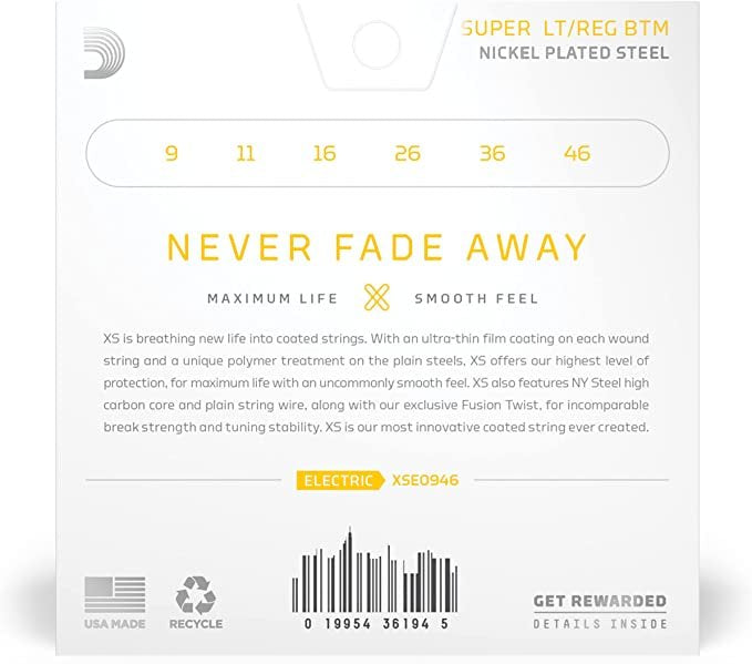 XS Nickel coated electric guitar strings provide the longest life of any D’Addario electric guitar string. Coated with our groundbreaking XS coating, these premium electric strings attain maximum life and a smooth, fast feel without dampening their outstanding tone. Constructed with a NY Steel core, reformulated nickel-plated steel wrap wire, and Fusion Twist technology, XS Nickel strings boast superior strength and tuning stability, plus richer harmonics, greater clarity, and remarkable definition with every sweep, slide, and bend. This 09-46 Super Light Top/Reg Bottom gauge set has more low-end tone than Super Light, while staying flexible for bends.