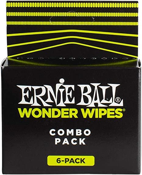 Wonder Wipes Combo 6-pack of individually sealed instrument care wipes. Each box includes 1 pack of Fretboard Conditioner, 2 packs of Instrument Polish, and 3 packs of String Cleaner.